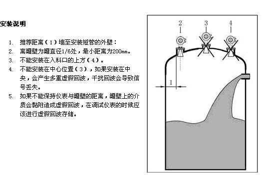 喇叭天線必須調整至垂直,不要讓雷達束指向罐壁。